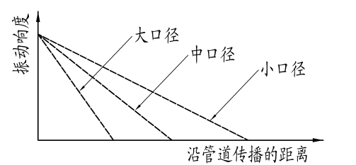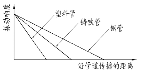 另外,不同材质的管材沿管道传播的衰减也是不同的,金属材料的管道要比非金属管道传播的远(见示意图)。