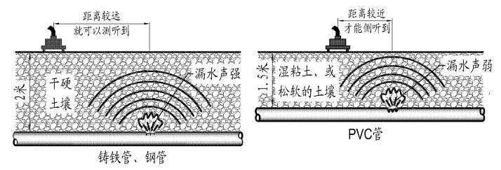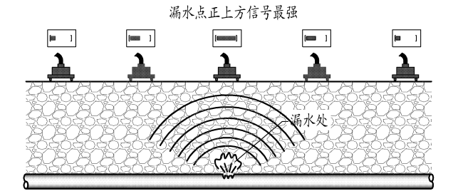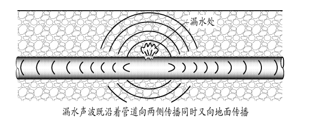 管道埋设于地下,管道中的液体涌出冲击土壤,管道的裂口和周围的土壤会产生振动,这些振动能传导至地表产生噪声,这种噪声包含液体流动的声音、撞击声、摩擦声、振荡声等,是一种综合的声音,声音品质(声音的大小和频率范围)与漏口的大小、压力、深度、管道的材料有关,地表上可测听到声响。