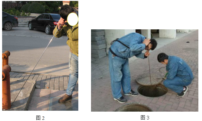 使用时是将钢杆前端接触管道暴露点,如阀门、消火栓、裸露的管道部位等,耳朵紧贴听筒仔细辨别有关声响,因为漏水口的声波信号可以沿管道方向传播,通常金属管道的漏水声音传播较远,有的可达几十米;而非金属管道的传播距离较近,只有十来米或更近;口径小的管道传播距离远,口径大的管道传播距离近。因此可以诊听到该管道附近是否漏水(见图2、图3),有经验的检测人员甚至可以估算出漏水点的大致距离。